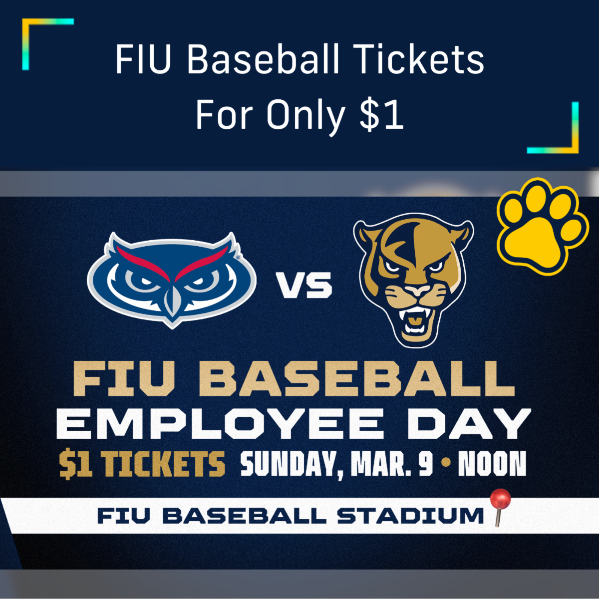 Catch the excitement of FIU Baseball for just $1 as the Panthers face off FAU on Sunday, March 9 at 12 p.m. at the FIU Baseball Stadium.