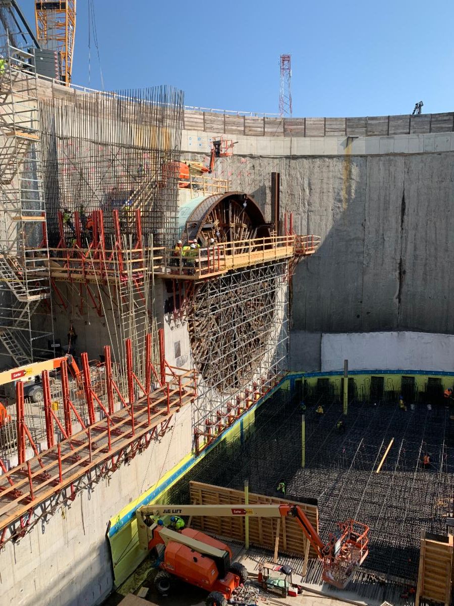 Work on the South Island launch pit is moving along smartly. The launch pit base slab is ¾ of the way complete and crews are focusing their attention on Cell 1 preparing the headwall for the start of tunneling operations. Crews also continue assembly of the TBM components, both in the launch pit and on the island surface.