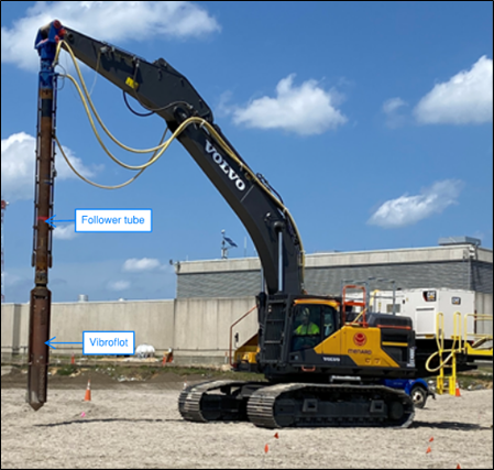 The Vibroflot is a long slender steel tube with two distinct parts: the vibrator and the follower tubes. The attachment is connected by a strong elastic material to the follower tubes, connected to an excavator and the compaction is performed by a trained certified operator.