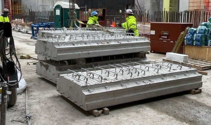 | (Right) Precast concrete deck panels that will form the roof of the low point pump station in the tunnel arrive for installation. | |