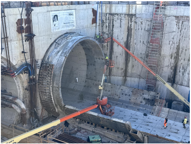 Now that Mary is completely underground, crews can demolish part of the gantry cradle and create the temporary ramp needed to deliver tunnel segments inside the newest tunnel. Also on North Island, the Tunnel Approach Struture (TAS) team now has space to begin working on the tunnels' approach structure.