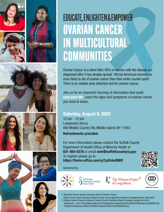For more information, please contact the Suffolk County Department of Health Office of Minority Health at 631-854-0378 or email omh@suffolkcountyny.gov