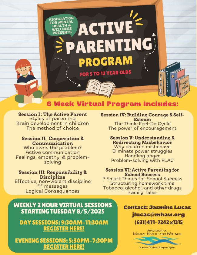 This weekly group is offered at no cost to participants and takes place virtually. Join them on Wednesdays from 7-8:30PM virtually via Zoom. Contact Jasmine Lucas, MHC at 631-471-7242 ext. 1315 or at jlucas@mhaw.org to learn more or register to attend!