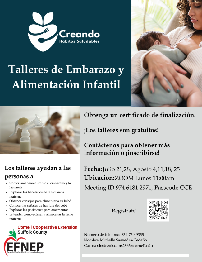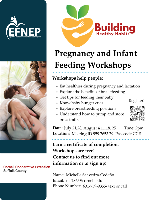 Building Healthy Habits Pregnancy and Infant Feeding Workshops are being offered in English and Spanish throughout the month of August! Earn a certificate of completion- workshops are free! Contact Cornell Cooperative Exrension of Suffolk County to sign up now by emailing Michelle Saavedra-Cedeno at ms2863@cornell.edu or by text/call at 631-759-9355