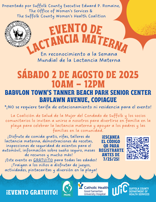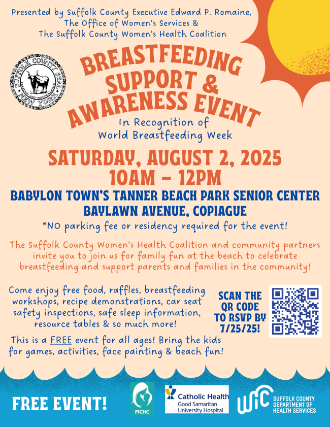 Presented by Suffolk County Executive Edward P. Romaine, The Office of Women’s Services & The Suffolk County Women’s Health Coalition: The Suffolk County Women’s Health Coalition and community partners invite you to join them for a breastfeeding support and awareness event in recognition of World Breastfeeding Week to celebrate breastfeeding and support parents and families in the community! Join them on Saturday August 2nd from 10AM-12PM at Babylon Town's Tanner Beach Park Senior Center (Baylawn Ave., Copiague) There is NO parking fee or residency required for the event!
