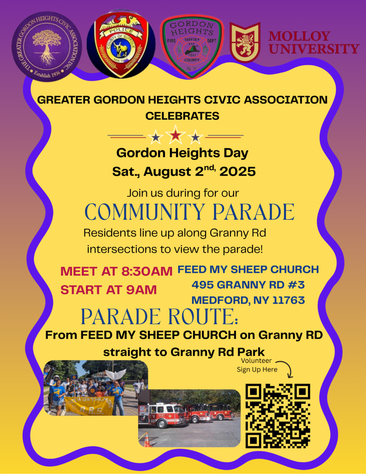Attend a Gordon Heights FREE Community Paradthis Sunday August 2nd at 9AM at 495 Granny Rd. #3 Medford, NY 11763.