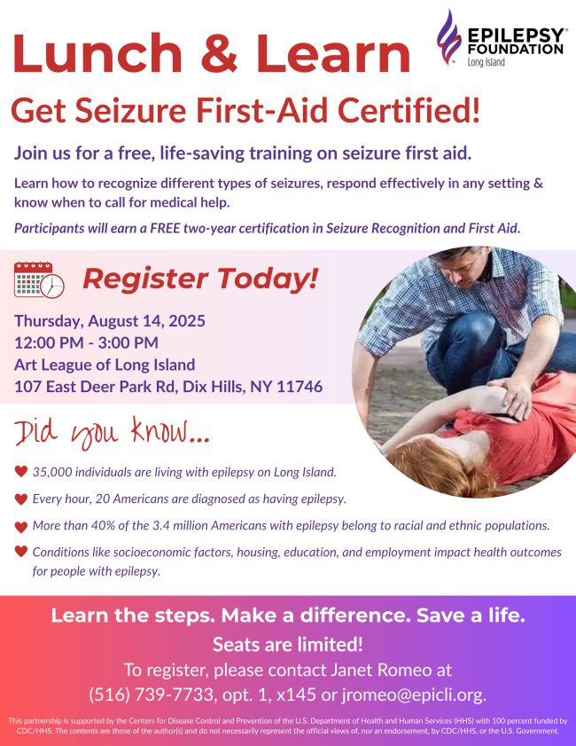 The Epilepsy Foundation Long Island invites you to attend the Lunch and Learn at the Art League of Long Island in Dix Hills on Thursday, August 14 from 12:00 pm - 3:00 pm. To register please email Janet Romeo at jromeo@epicli.org