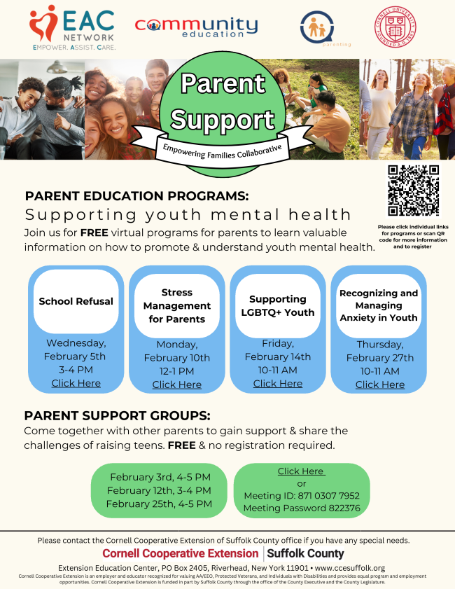 Cornell Cooperative Extension of Suffolk County, in collaboration with EAC Network, is hosting Parent workshops and parent support groups. Come together with other parents to learn valuable information to promote and understand youth mental health, and gain support & share the challenges of raising teens. This is free and no registration is required. Upcoming dates for support groups and workshops include 2/3, 2/5, 2/10, 2/12, 2/14, 2/25, 2/27