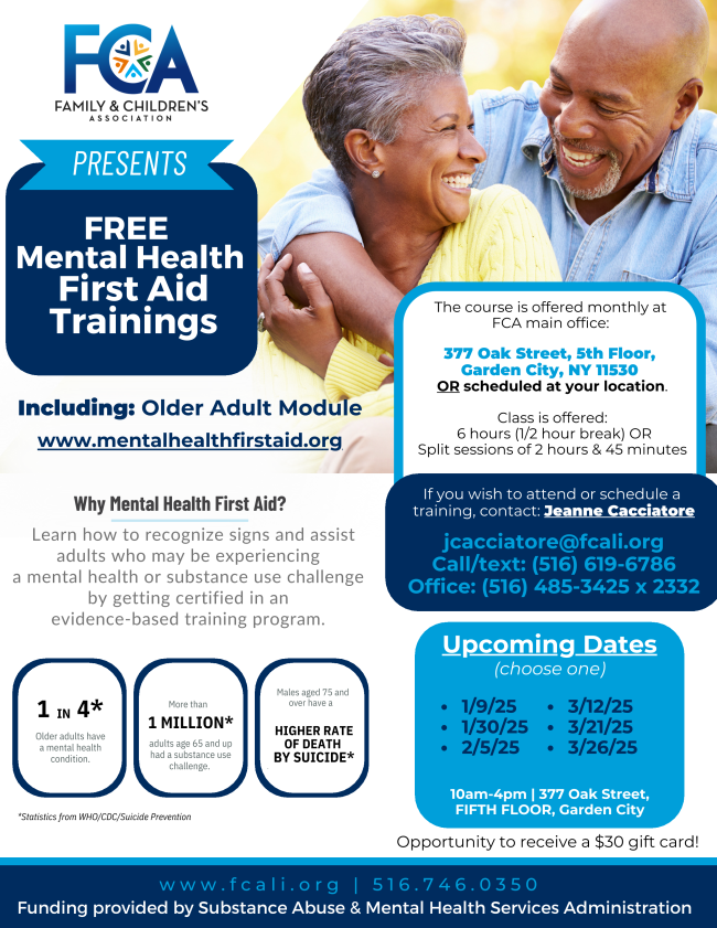 FCA's FREE Mental Health First Aid Classes are free for attendees who interact in ANY capacity with ANY Nassau County residents who are 55 yrs old and over (friends, family, colleagues, patients, clients, etc.). Upcoming dates include 2/5, 3/12, 3/21, and 3/26.