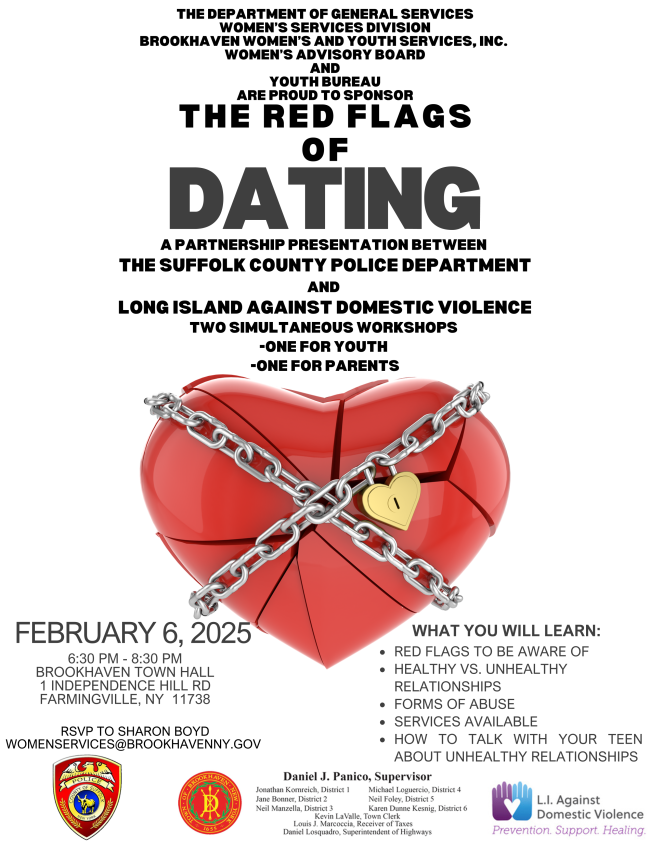 The Red Flags of Dating, a partnership presentation between the Suffolk County Police Department and Long Island Against Domestic Violence will be held on February 6th, 2025 from 6:30PM-8:30PM at Brookhaven Town Hall (1 Independence Hill Road, Farmingville NY 11738). There will be two simultaneous workshops, one for youth, one for parents. You will learn red flags to be aware of, healthy vs. unhealthy relationships, forms of abuse, services available, and how to talk with your teen about unhealthy relationships. RSVP to Sharon Boyd at womenservices@brookhavenny.gov