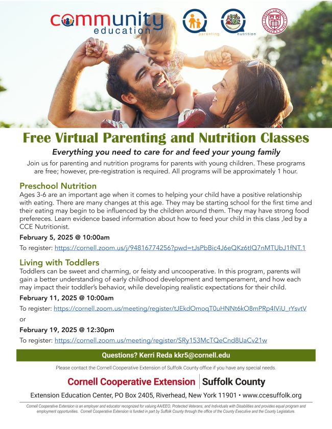 Cornell Cooperative Extension of Suffolk County, is hosting FREE virtual Parenting and nutrition workshops for parents with young children. These are free classes but registration is required. ALL programs will be approximately one hour . | |
