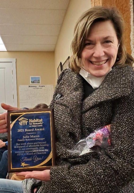 During our Annual Meeting, the 2021 Board Award was presented to Family Resource Manager, Julie Maron for her "work above and beyond in support of affordable housing in our community". Well deserved!