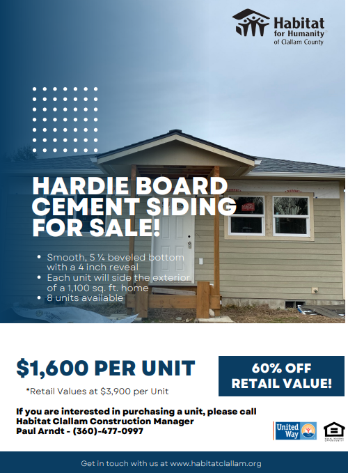 6 Units available, each unit will side the exterior of a 1,100 sq.ft. home. If interested, please call Habitat Construction Manager, Paul Arndt at 360-477-0997