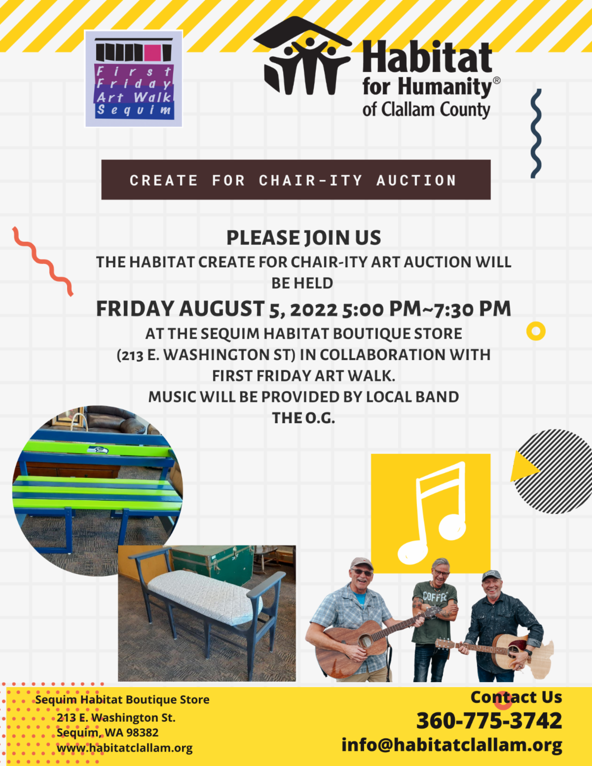 Please join us Friday August 5, 5:00pm~7:30pm at the Habitat Boutique Store for our Create for Chair-ity Art Auction in collaboration with First Friday Art Walk where we will have artistically designed chairs created by community members for you to bid on. Live music will be provided by local band