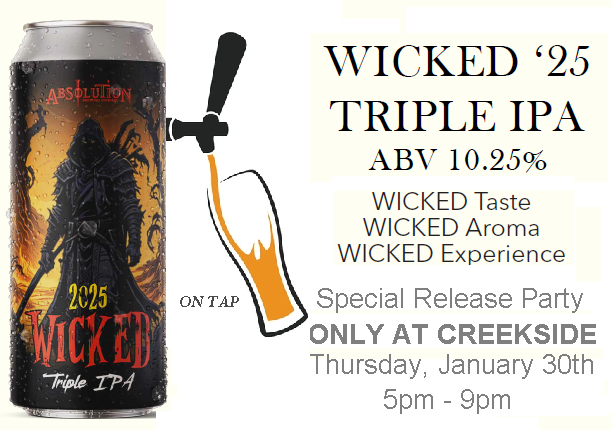 GET WICKED: Join Us This Thursday | Craft Beer Fans Rejoice this Thursday at Creekside Taproom with the first of the Big 3 beers: Absolution's WICKED '25 release party. This 10.25% Triple IPA sold out in under three hours last year. We've tripled our order this year, so we hope to make it to 9pm. WICKED features Nelson Sauvin, Mosaic, and Strata hops, making it smooth and very drinkable. Get WICKED this Thursday, January 30th. Come to Creekside for Absolution. | | |