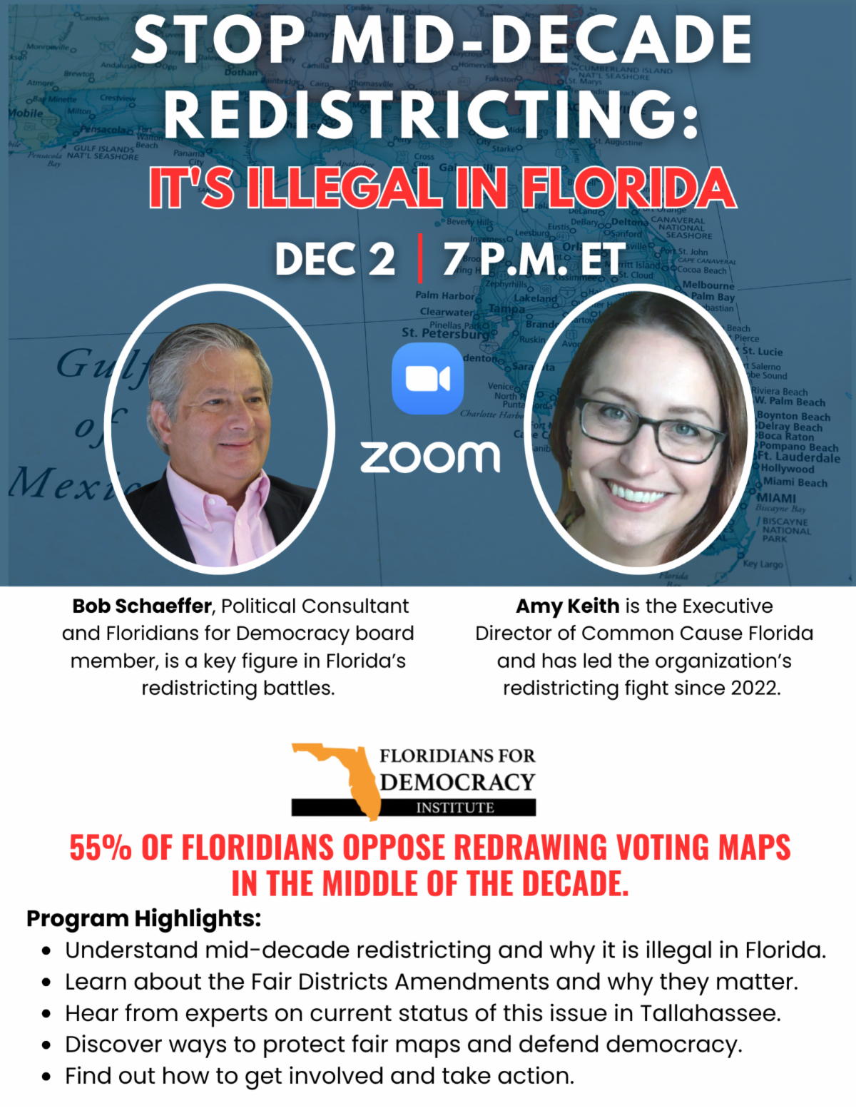 Amy Keith is Common Cause’s Executive Director for Florida. She leads the organization’s work to create open, accountable government in the Sunshine State and empower all Floridians to make their voices heard in the political process. She also co-leads the Florida Election Protection Coalition, which brings together over 30 local, state and national partners to help ensure all eligible Florida voters can cast their ballot and have it counted – in every election. Amy has over two decades of domestic and international nonprofit management, advocacy and coalition-building experience. Amy holds a Master of Public Administration from Columbia University and a BA in Philosophy from Bates College. Learn More about Common Cause Florida.
