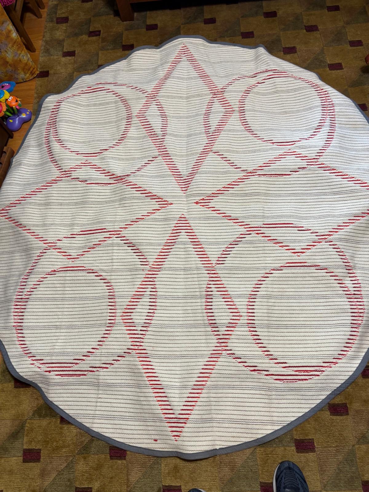 I started with the brightest red and worked all the lines in the holes and the weft to establish the pattern. Worked the designs inward from there. I decided that the diamond should be the predominate design but I also still wanted to keep the appearance of the large circle going through it so on the corners of the design I think this can be seen.