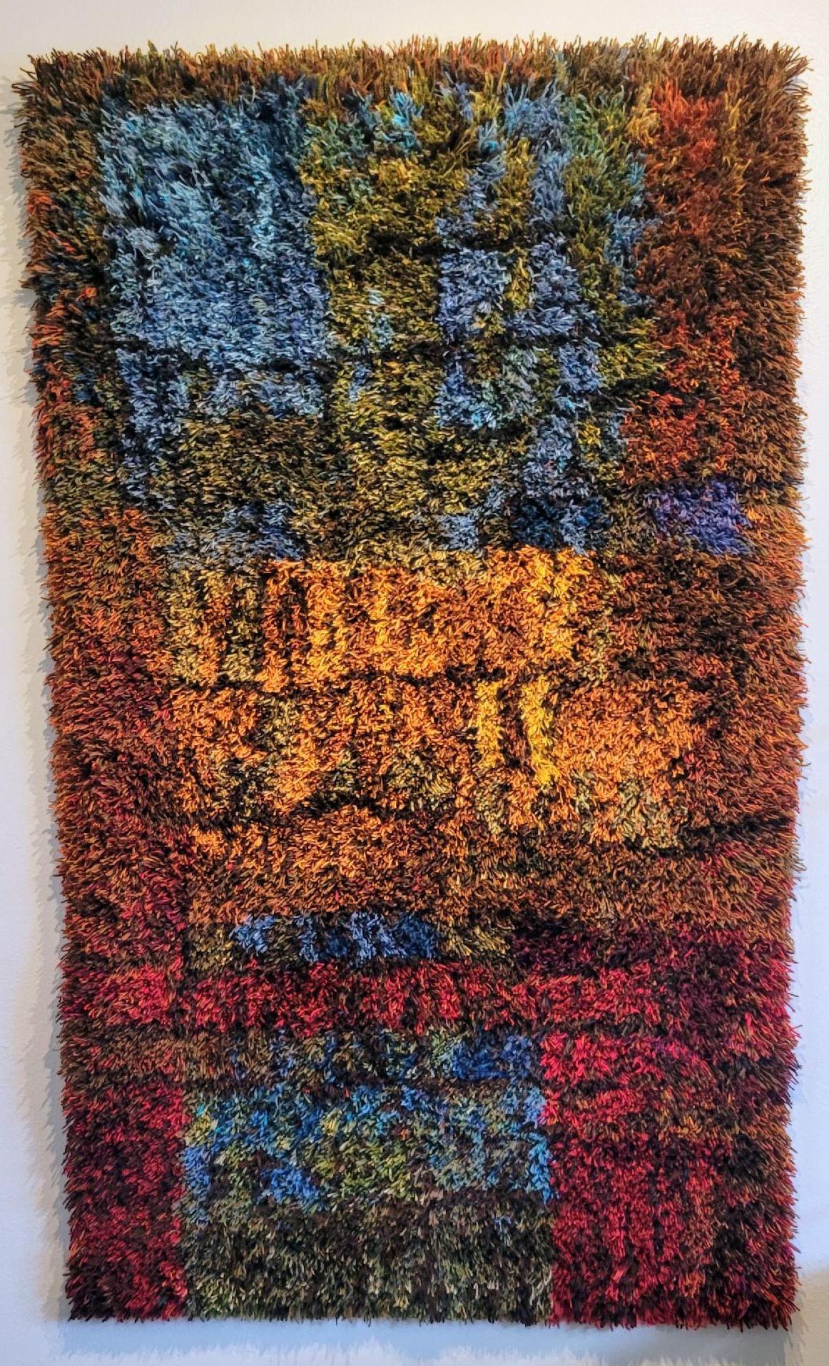 Barbara was in my class at Common Ground on the Hill. She was totally new to rya rug making. She is an excellent jewelry designer and also taught at CGOTH (Check her out.) Now she is an excellent rya designer and knotter. Inspired by a field of sunflowers at sunset. Makes me smile.