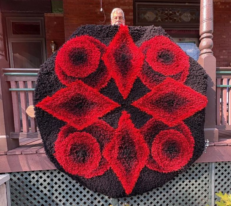 He amazed us at the top of this newsletter with his round rya of his own design. He is always very generous in sharing his self-taught tips. Take a close look at his progress and learn from the master. Now you'll know the rest of the story.