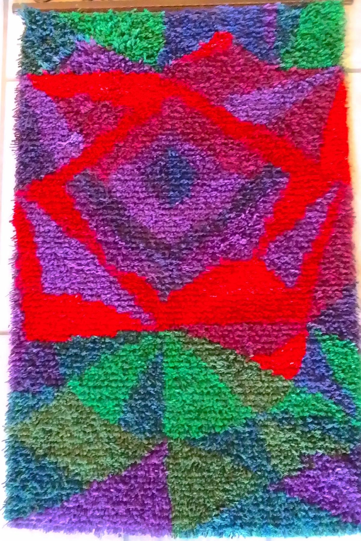 Elaine from Columbus, Ohio designed this beauty. I asked her about it, and she replied, "Melinda, this rug is my own design. I was attending Miami University in Oxford Ohio as a Fine Arts major. Through my professor, I discovered the intriguing world of Rya Rugs. With a fascination for fabric arts, rug hooking, rug punching, needlepoint, this new art was intoxicating. The supplies were purchased in Cincinnati Ohio and the name of the woman who supplied us, escapes me. I still have some of the yarn from that time - 1975.