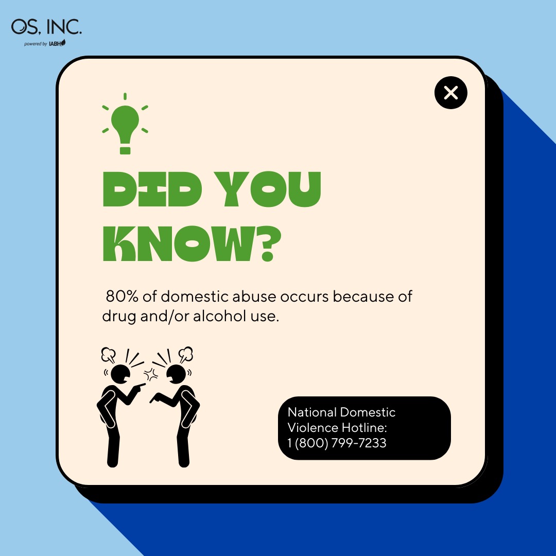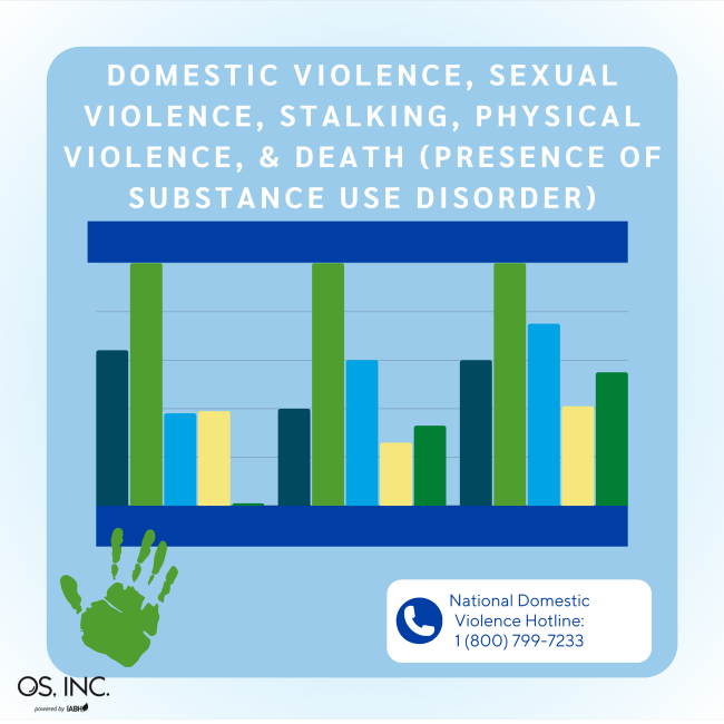 The risk of domestic abuse increases when a substance use disorder (SUD) is present, even more so when both partners have a SUD. Research shows that anywhere between 40%-60% of reported domestic abuse situations involve alcohol or drug use. Individuals with a substance use disorder are four to ten times more likely to commit acts of violence against their partner and/or children.