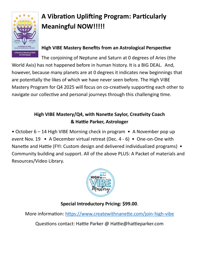 High VIBE Mastery, a program designed by me, in partnership with Nanette Saylor, Creativity Coach, that supports participants in manifesting wishes, hope and dreams is approaches being one year old. The fall session of this uplifting year long program begins October 6 at 7:00 PM on Zoom. Being aware we are living through unprecedented times of change when people need support and love we are opening enrollment for Q/4. More information can be found on the next page.