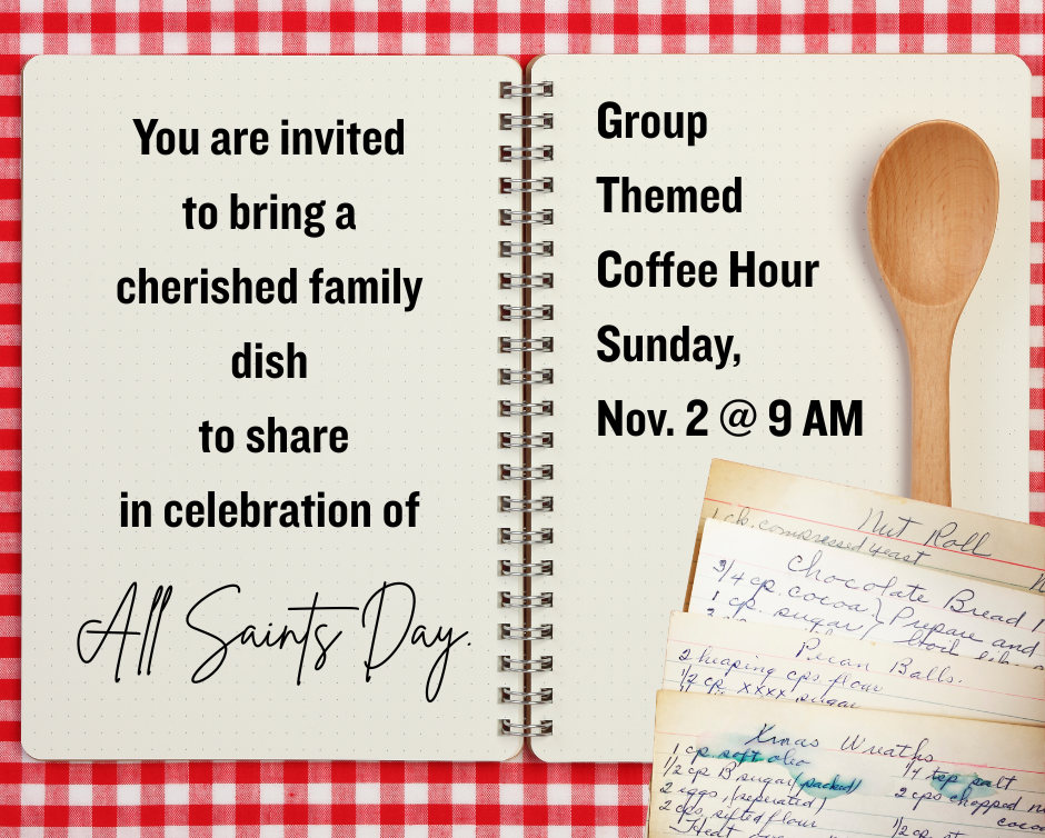 Speaking of food: make a favorite family recipe to share at our All Saints Coffee Hour! This special themed coffee hour honors our loved ones as we share the dishes that they loved best. Coffee Hour occurs in between our two worship services, from 9:00-9:50.