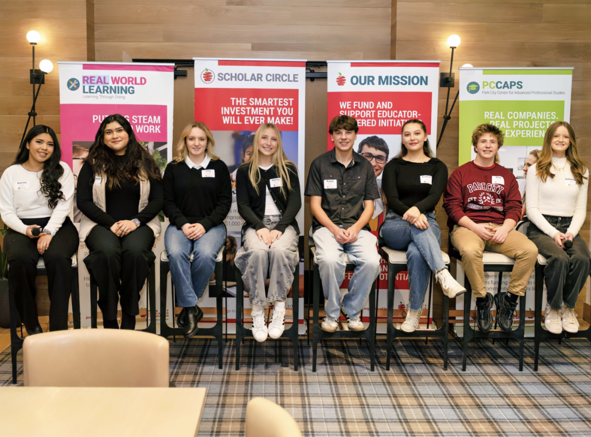 | The Running with Ed Committee celebrating the Best Fundraiser Award alongside Running with Ed sponsor, Chesley Electric. | | PCHS Student Panel (from left): Danna Reyes, Isabel Reyna, Lilly Stensen, Ashley Tettelbach, Rylan Betkler, Evalina White, Alec Lebwohl, Kat Jones, | | It was an amazing, energetic evening hearing from the PCHS Student Panel and Superintendent Lyndsay Huntsman at the Scholar Circle event at KITA at Pendry Park City. Students shared how PCEF-supported programs – including PCCAPS, photography, theater, drone/aviation, orchestra, band, debate, Bright Futures, Latinos in Action and others – are shaping their education and future goals. Thank you to our panel and everyone who joined us! |