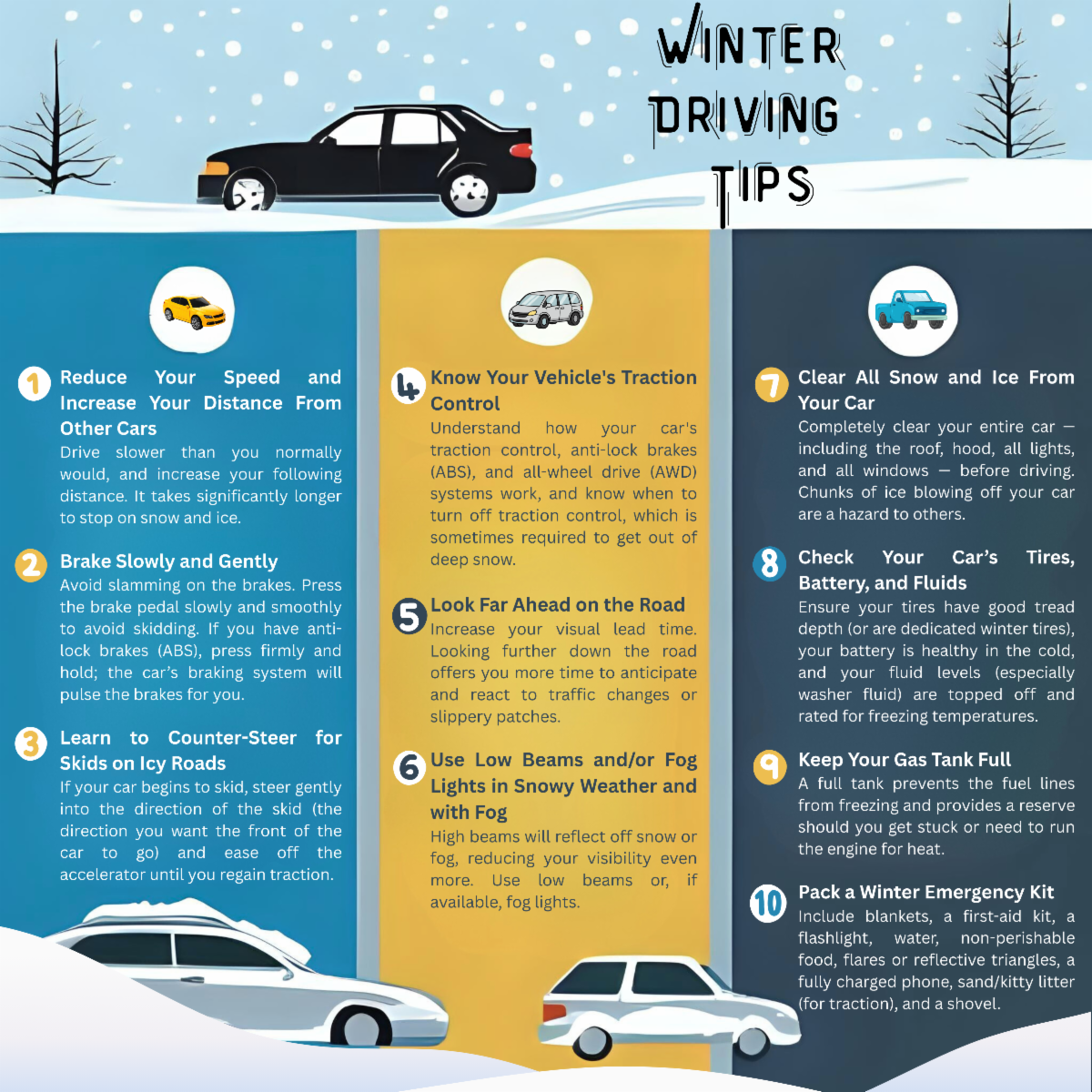 Winter weather can create dangerous, intimidating conditions on our roads. While beautiful mountain snow and holidays with our families bring us together, we must consider the habits it takes to keep ourselves and our fellow drivers safe throughout the season. I find that preparedness is the key to personal driver safety in the winter. I strongly recommend having the right tires, the right emergency preparedness kit, checking the weather before a drive, and setting serious standards for when to call off an unsafe trip plan. Small habits like making sure to always keep at least a half tank of gas in your car can make a life-saving difference.