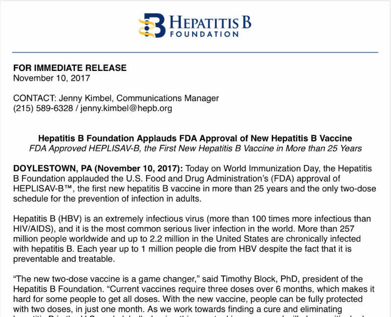 The Hepatitis B Foundation applauds FDA Approval of a new hepatitis B vaccine, HEPLISAV-B, which is the first new hepatitis B vaccine in more than 25 years! The current three dose vaccine is given over a six month schedule and provides lifetime protection against hepatitis B. The new-two dose vaccine provides the same lifetime protection, but in just one month.