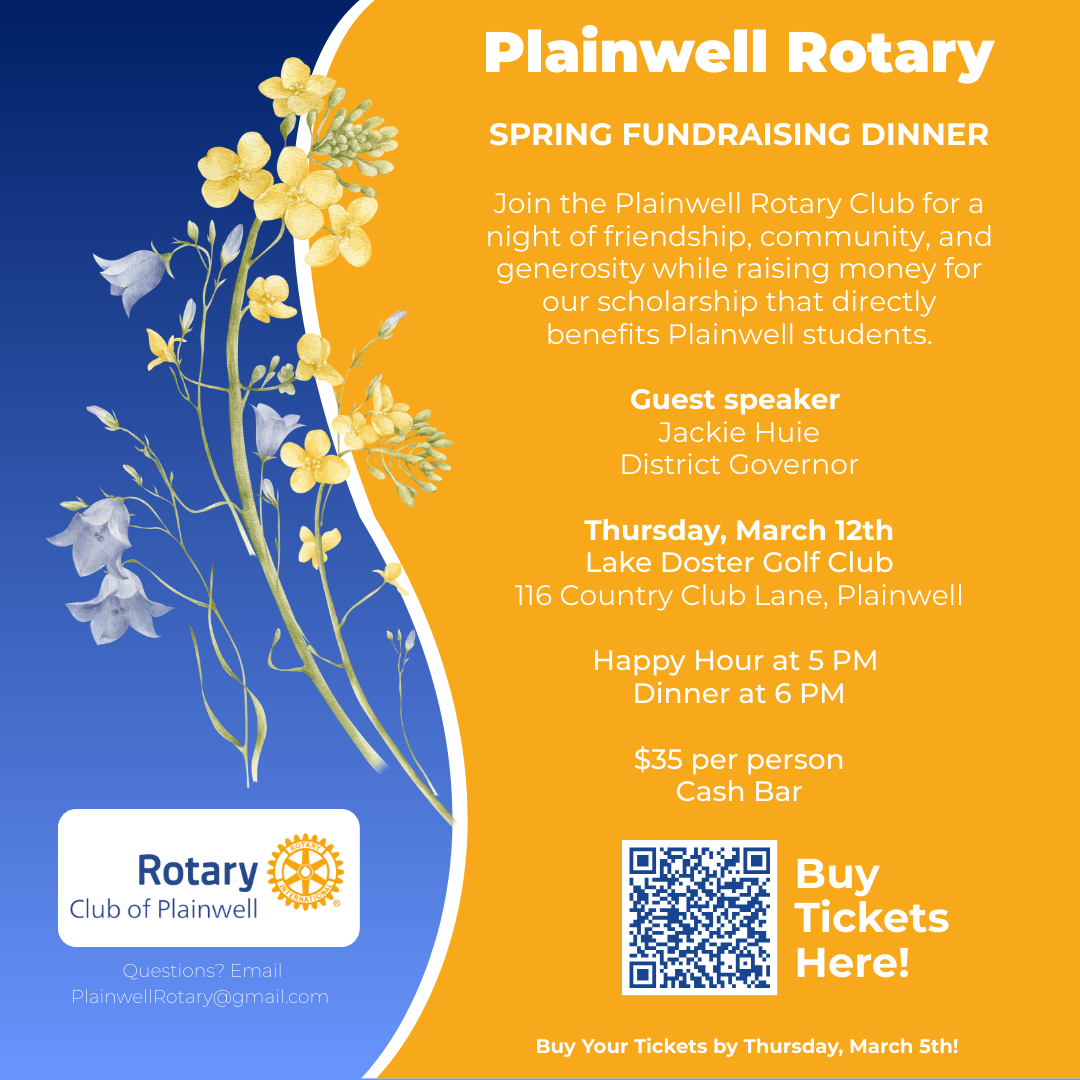 | Enjoy happy hour beginning at 5:00 PM, followed by dinner at 6:00 PM, and hear from our guest speaker, Jackie Huie, District Governor. All proceeds from the evening support a scholarship that directly benefits Plainwell students. | |