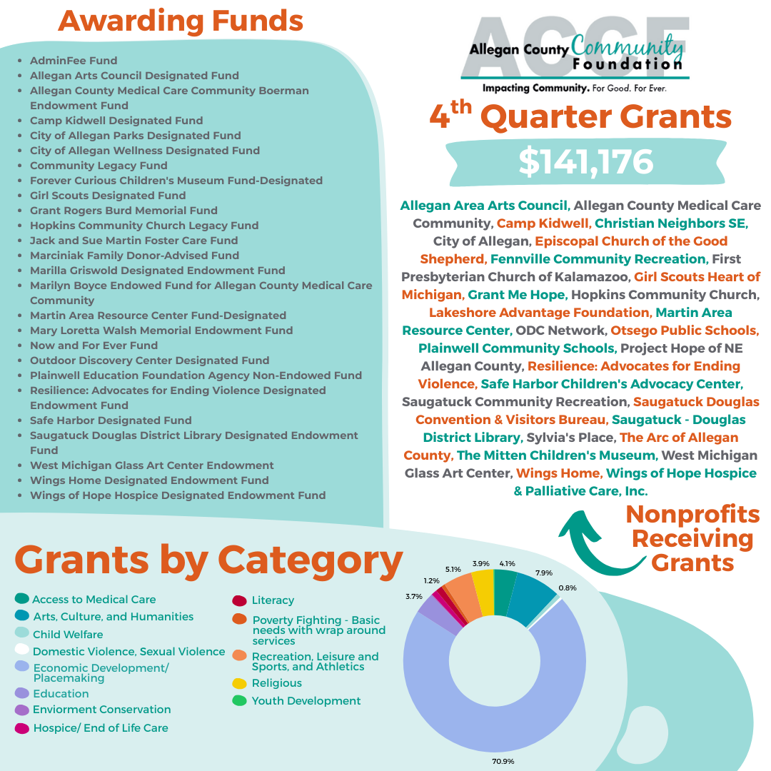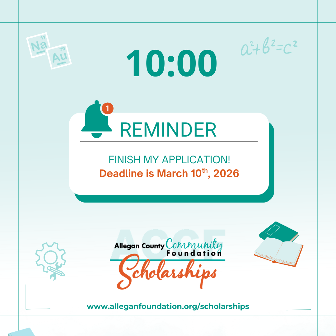 | | In the fourth quarter of 2025, ACCF awarded $141,176 in grants to nonprofits serving Allegan County, supporting everything from arts and education to health, housing, and basic needs. Thanks to our generous donors, these dollars are turning care into lasting community impact. | | With the March 10 deadline approaching, now is the time to complete your scholarship application. Whether your next step leads to college or skilled trade training, submitting today puts you on the path to funding that can help make your goals a reality. Just a few minutes could open doors to support your education, build new skills, and move you closer to the career you’ve been dreaming of. Don’t wait — if you have questions along the way, we’re here to help at scholarships@alleganfoundation.org | | |
