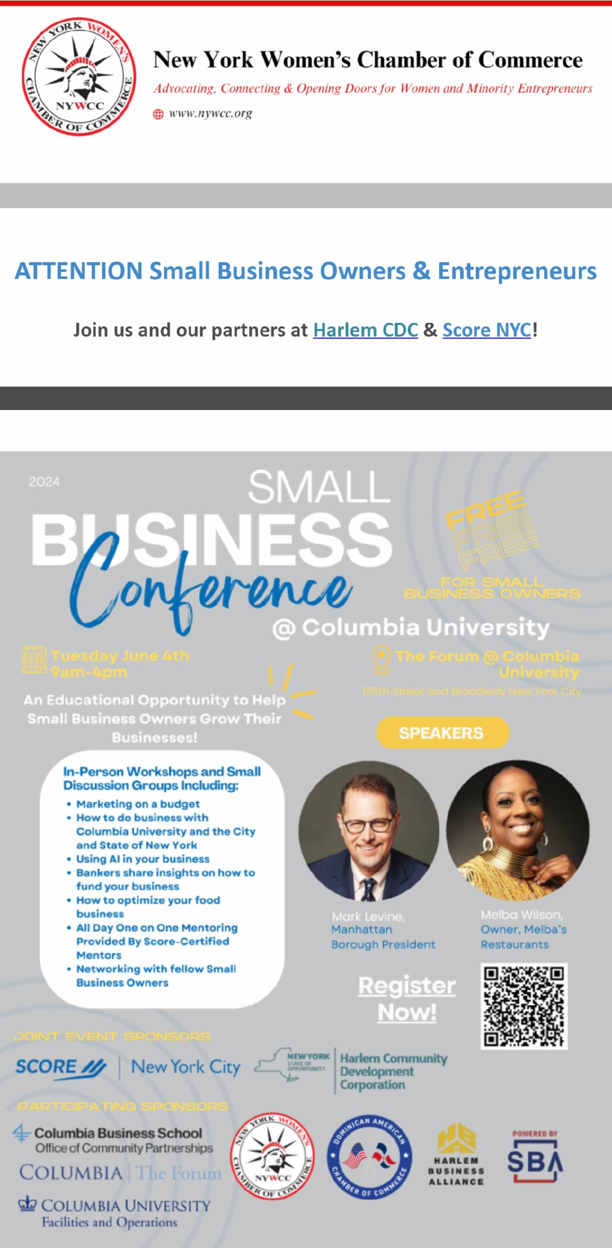 On behalf of the New York Women's Chamber of Commerce, Aero-Ba-Soul, Inc.'s CEO & Co-owner Kecia Palmer-Cousins will co-present the "Doing Business with NYC and NYS Workshop" with SCORE Mentor Francisco Guzman at the 2024 Small Business Conference! | |