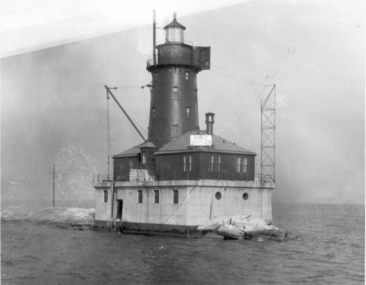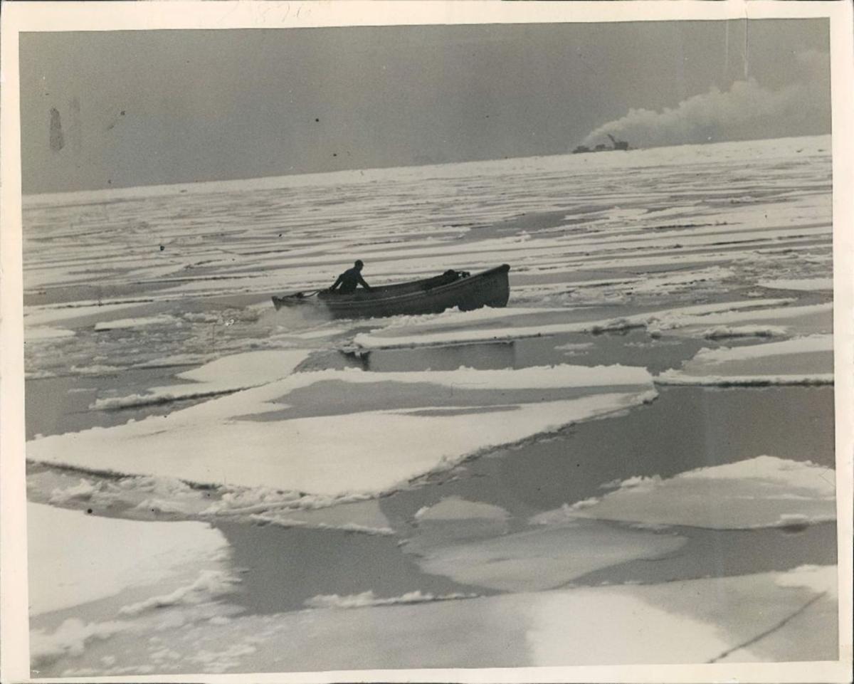 Original January 8, 1936, Photo Caption: "Plowing through the ice with a small lighthouse motorboat, this Lighthouse keeper was observed by a Daily Times Cameraman going to work this AM." – Source: USLHS | |