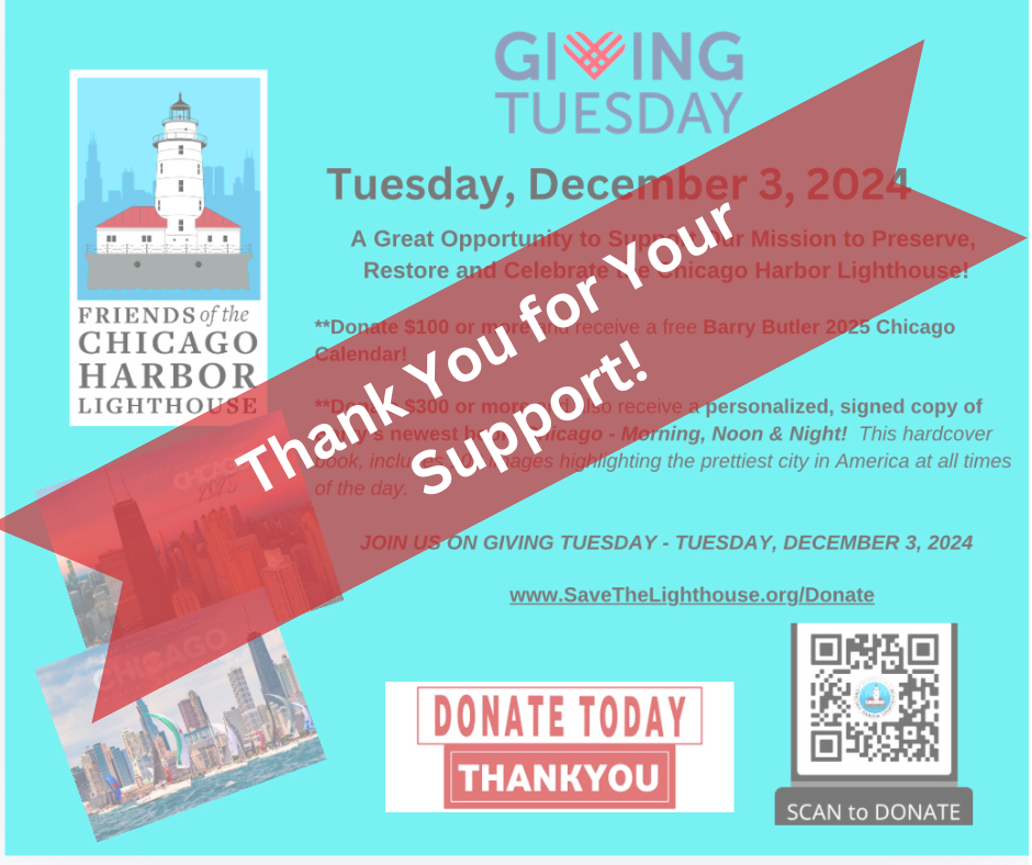 Thank you for supporting the Friends of the Chicago Harbor Lighthouse and the Chicago Maritime Museum. Together, we’re keeping the light shining bright for future generations.