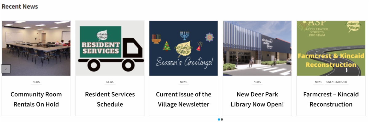 This month, attention is directed toward the Recent News section of the website, located just below the interactive aerial tour at the top of the page. Recent News is where you'll want to check regularly for announcements regarding current projects, resident services, community activities, the latest edition of Amberley Village E-News and other timely information.