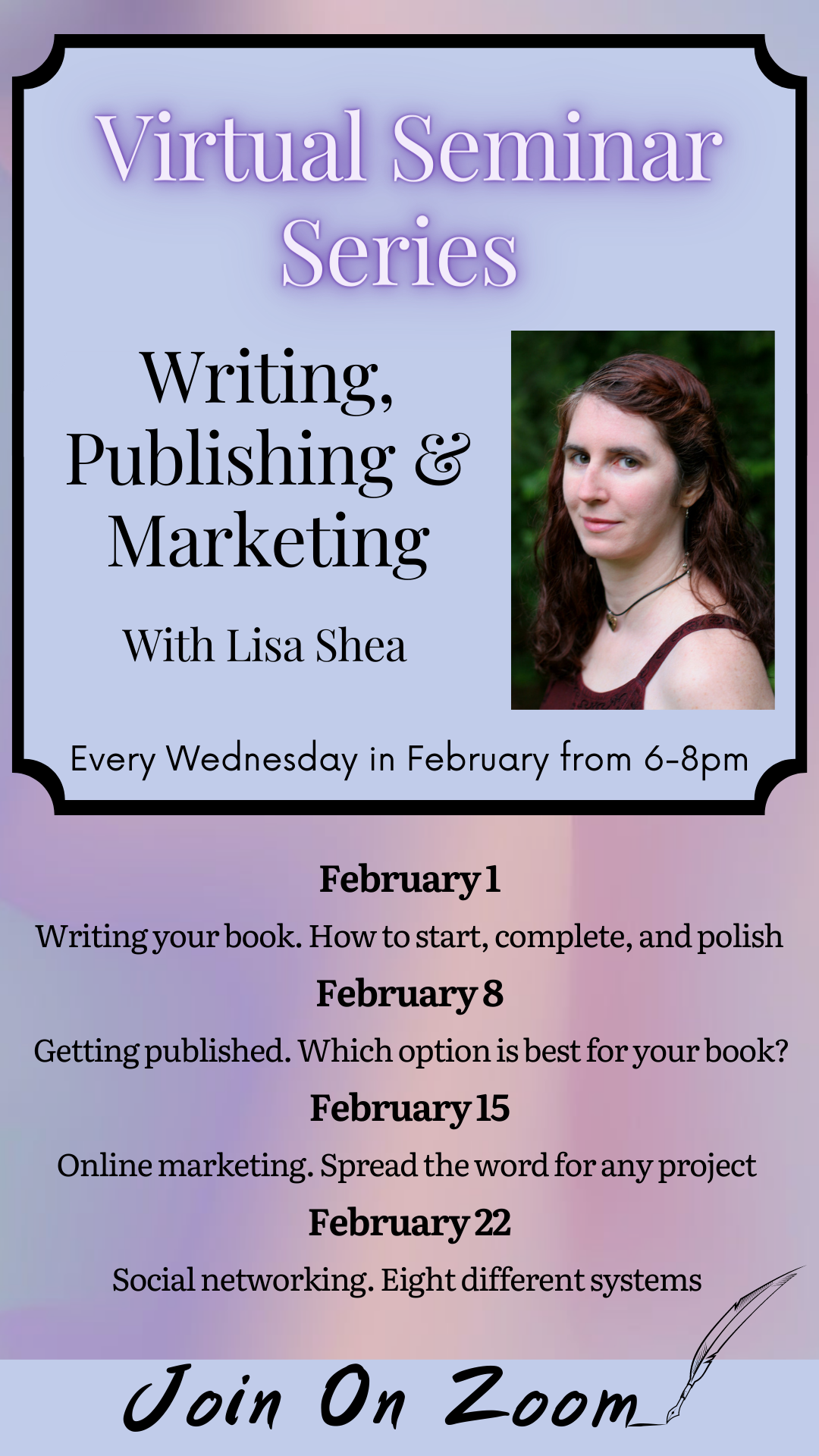 Lisa Shea will be holding a free publishing, marketing and social networking seminar series virtually on zoom. Lisa Shea is an award-winning author and entrepreneur. She has published over 500 books on Amazon and launched several million-pageview-a month websites.