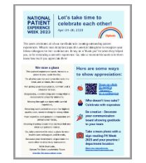 This week celebrates all of our contributions in creating outstanding patient experiences. What is most important about this week is taking time to recognize your fellow colleagues for their contributions. It may be a "thank you" for when they helped you, or for enhancing a patient's experience. So, take a moment this week to let them know how much you appreciate them!