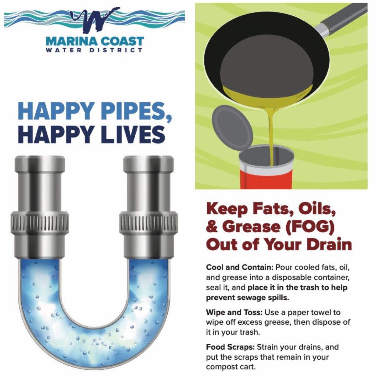 Putting fats, oils, and grease (FOG) in pipes is a major source of plumbing problems. When FOG is poured down the drain, it solidifies as it cools and creates clogs in pipes, leading to sewer overflows and back-ups.