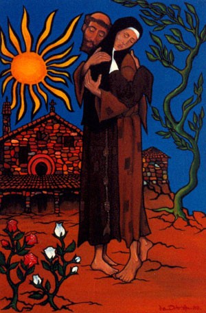In their embrace, they unite and give birth to the Franciscan-Clarian charism, represented by the strong branch reaching up to heaven. Francis' feet are raised up and he seems to lean on Clare. Throughout his life, whenever he had doubts and had to discern something, he would ask Clare to pray. An example was when the seraphic father was in doubt as to whether he should preach or lead life as a hermit.