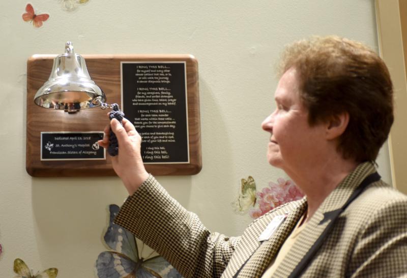 Sister Mary McNally, vice president of mission at St. Anthony's Hospital, stood in front of a room of cancer survivors to unveil a silver bell surrounded by butterfly stickers mounted to the wall of the Cancer Center lobby.