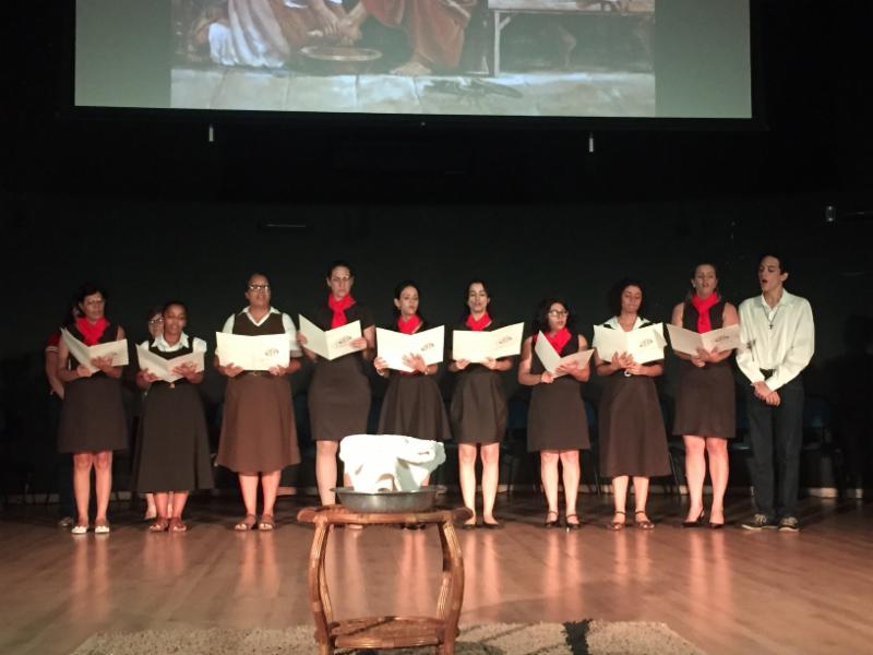 We truly enjoyed the hospitality of our sisters. Everywhere we visited we are treated to the local flavors of juices, fruits, and baked goods like pão de queijo (small cheese biscuits) and great meals. Wednesday morning we prepared to journey once again and to return for a more in-depth visit with our Sisters in Palmas. Palmas was founded in 1990 and is a very modern city. It is the capital city of the state of Tocantins, in central Brazil. In 2004, our Sisters built the school, Colégio São Franciso de Assis, for infant and elementary education. The school provides state-of-the-art classrooms, science laboratory, library, chapel, auditorium, sports center, green space, playground, and a canteen for the students. It is so apparent in meeting the students and staff that they are very welcoming and well-grounded in our Franciscan values and in the spirituality of Sts. Francis and Clare of Assisi. The afternoon of Holy Thursday the students, faculty, and parents gathered in the auditorium for an assembly. As we waited for the classes to arrive some students came and sat with us, introducing themselves in English and chatting. I enjoyed engaging them in some conversation in Portuguese. It made for a playful exchange. The focus of the assembly was the "Fraternity and Overcoming Violence," which is the campaign of all the dioceses of Brazil. Each year, the National Conference of Bishops in Brazil (CNBB) have a "Fraternity Campaign", an initiative that started after the Second Vatican Council to unite Catholics and the rest of civil society around a common theme. The older school students acted out brief skits portraying spousal abuse, verbal abuse, elder abuse, and workplace abuse. At the end of each skit the students remained posed and still on stage. A student dressed as Jesus came on stage and approached each of the student groups, touched them, raised them up, and embraced them as an invitation to turn away from violence. Each one was then invited to come sit on chairs in the center of the stage. The Jesus figure then came into the audience and invited a young mother holding her baby, Sr. Marinez, and me to the stage to join the students sitting there. The Jesus figure then began to recite and reenact the washing of the feet. It truly was a meaningful and moving experience. The assembly closed with some of the faculty and our sisters joined in song. It was wonderful to see our Sisters Maria Helena, Suzanne, Nara, and Dayanne on stage.