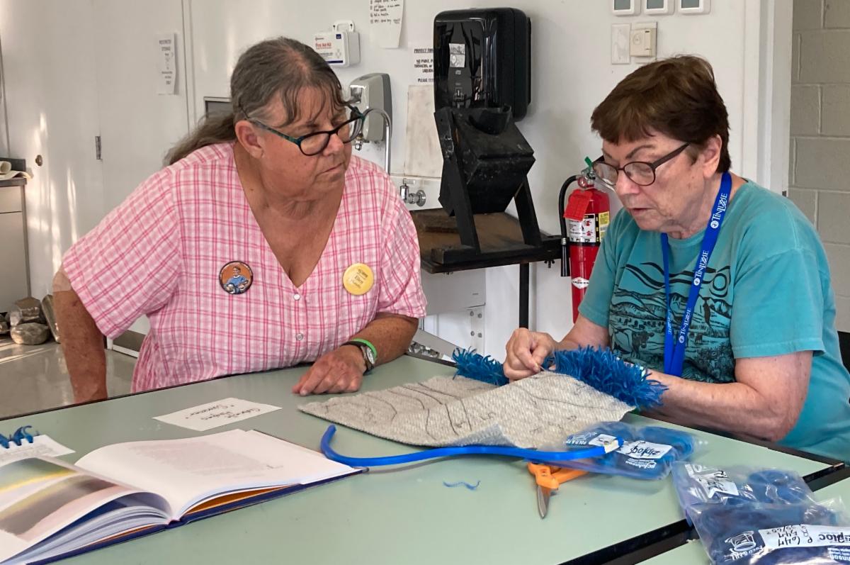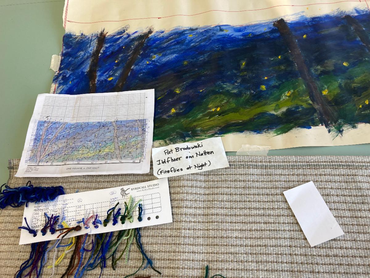They blend colors on their palette (the threading card). They either graph their design or draw it on the backing then calculate exactly (or loosely) how much yarn they need--and gather it. That all takes most of Monday through Thursday. By Thursday or Friday, the calculations are done and the knotting begins. The completion of projects comes days/weeks/months after the first knot, but everyone masters the knot before they leave the classroom. Students have already been sharing pictures of their progress since the last class. Follow the Rya Rugs Friends Group on the Byrdcall Studio Facebook page for occasional updates.