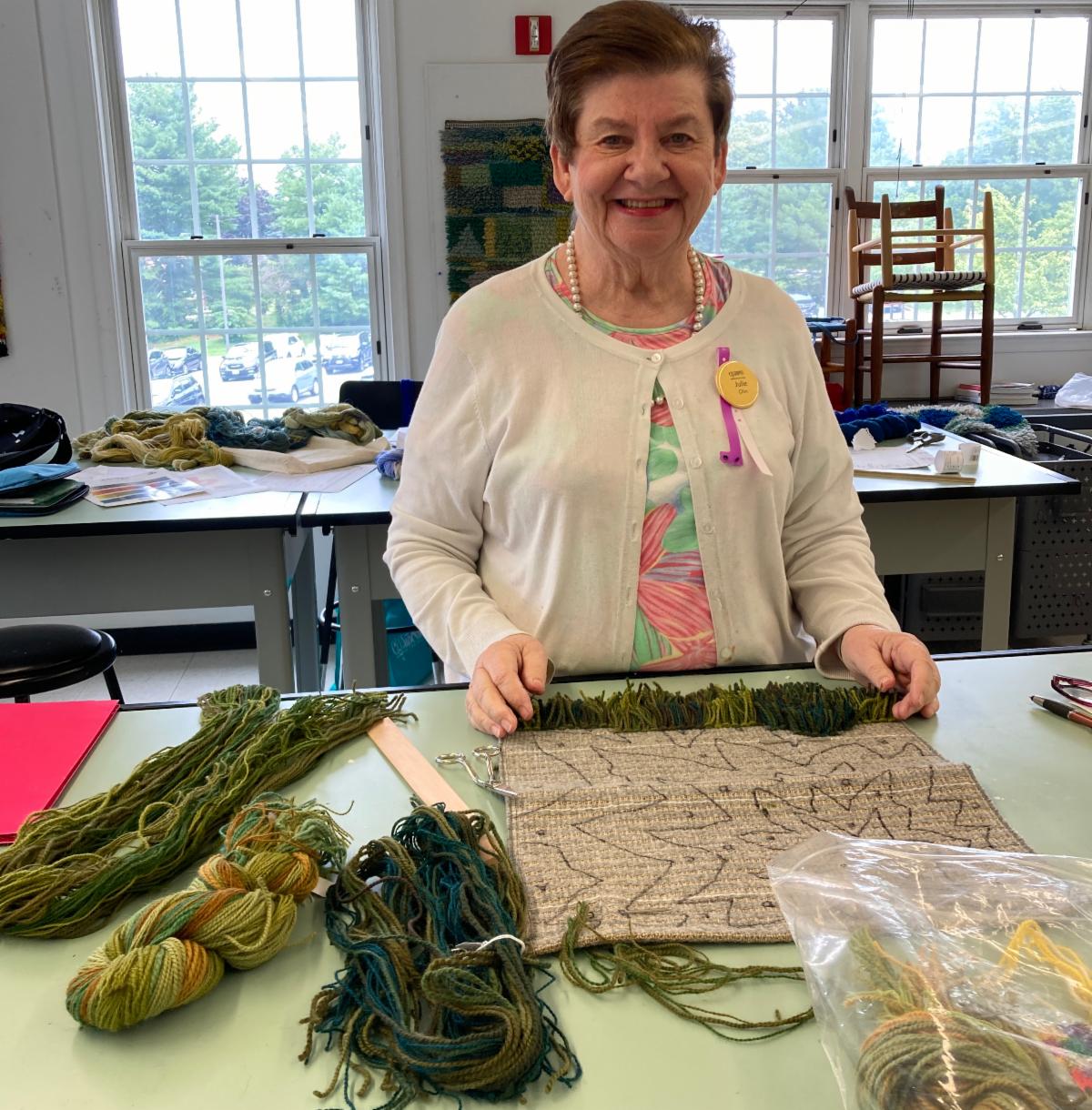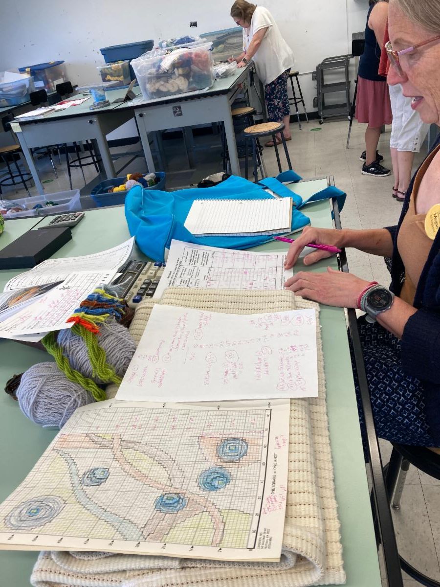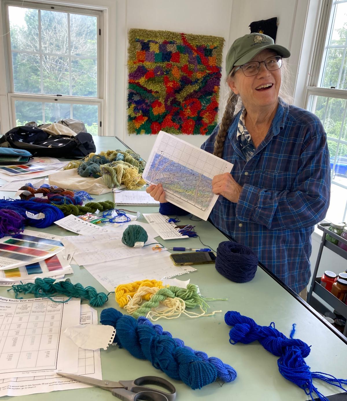 I have always loved teaching my rya designing class at Common Ground on the Hill. There are the challenges of packing and unloading my vehicle with every color and type of yarn the students could possibly want, plus small-to-medium size backings of all sizes, and teaching aids and supplies, but once the students arrive Monday morning, it is a steady progression towards their personal designs. It takes focus and maybe a morning cup of coffee.