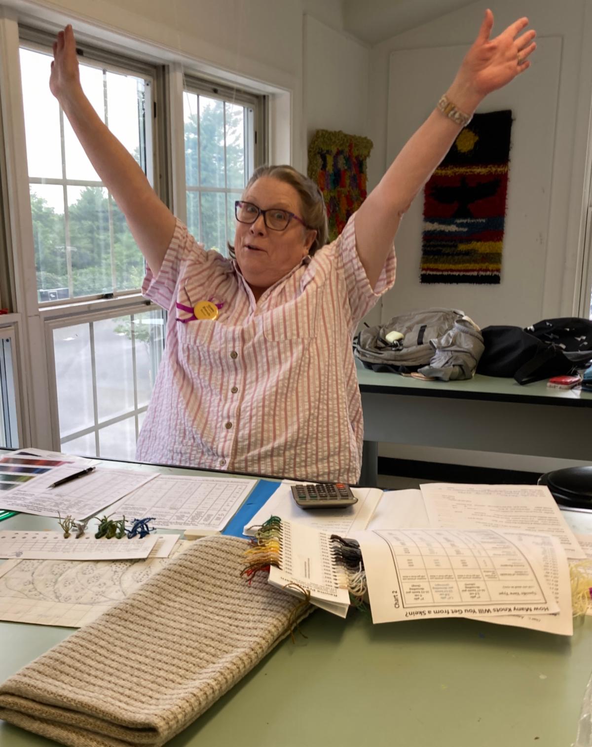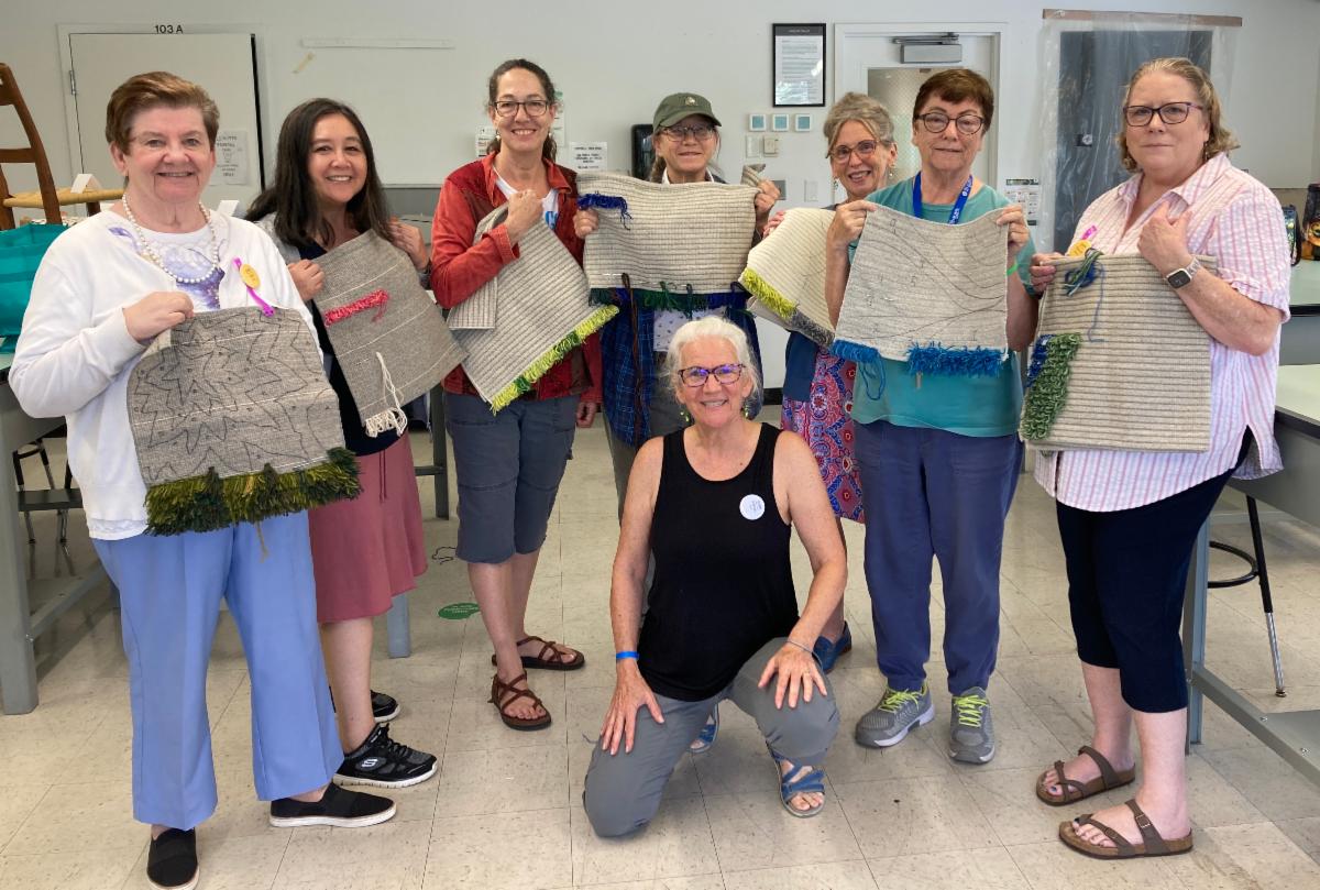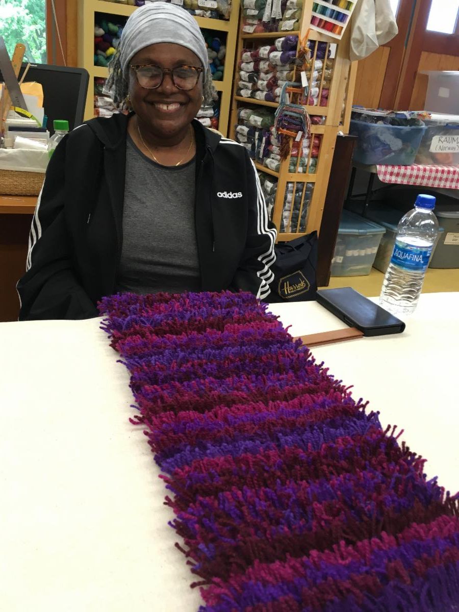 I have always loved teaching my rya designing class at Common Ground on the Hill. There are the challenges of packing and unloading my vehicle with every color and type of yarn the students could possibly want, plus small-to-medium size backings of all sizes, and teaching aids and supplies, but once the students arrive Monday morning, it is a steady progression towards their personal designs. It takes focus and maybe a morning cup of coffee.