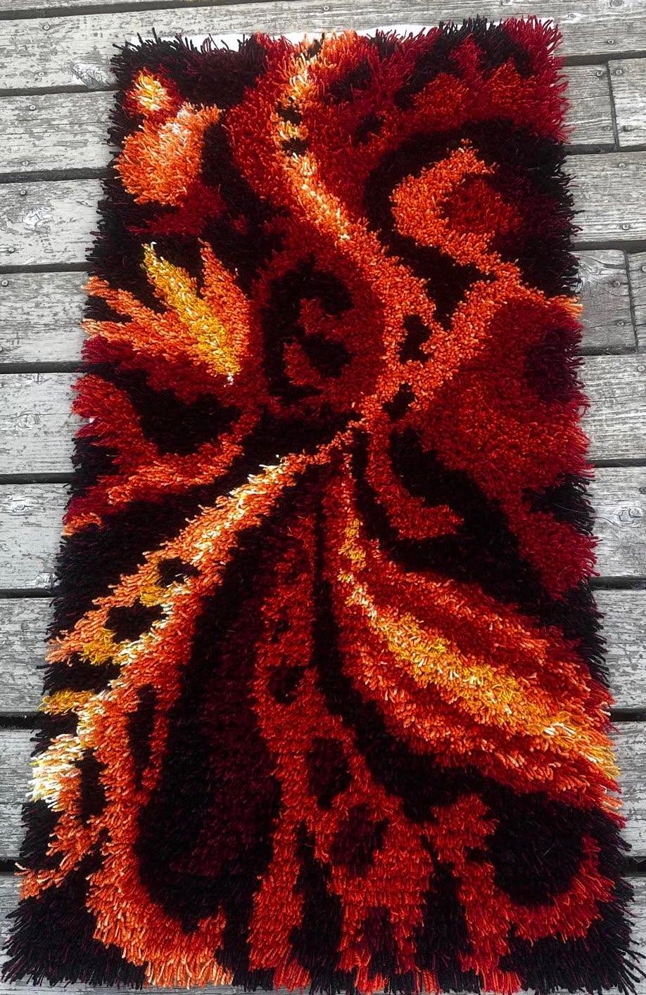 Anni has always had a passion for bright and dramatic designs. Here is another. "Firestorm was inspired by a Swedish Rya that I saw online. I used a graph for the first half, got bored and then went “free-hand for the rest. . . . My next Rya is designed but I haven’t decided on background colors or whether I am going subtle, bold or both LOL!"