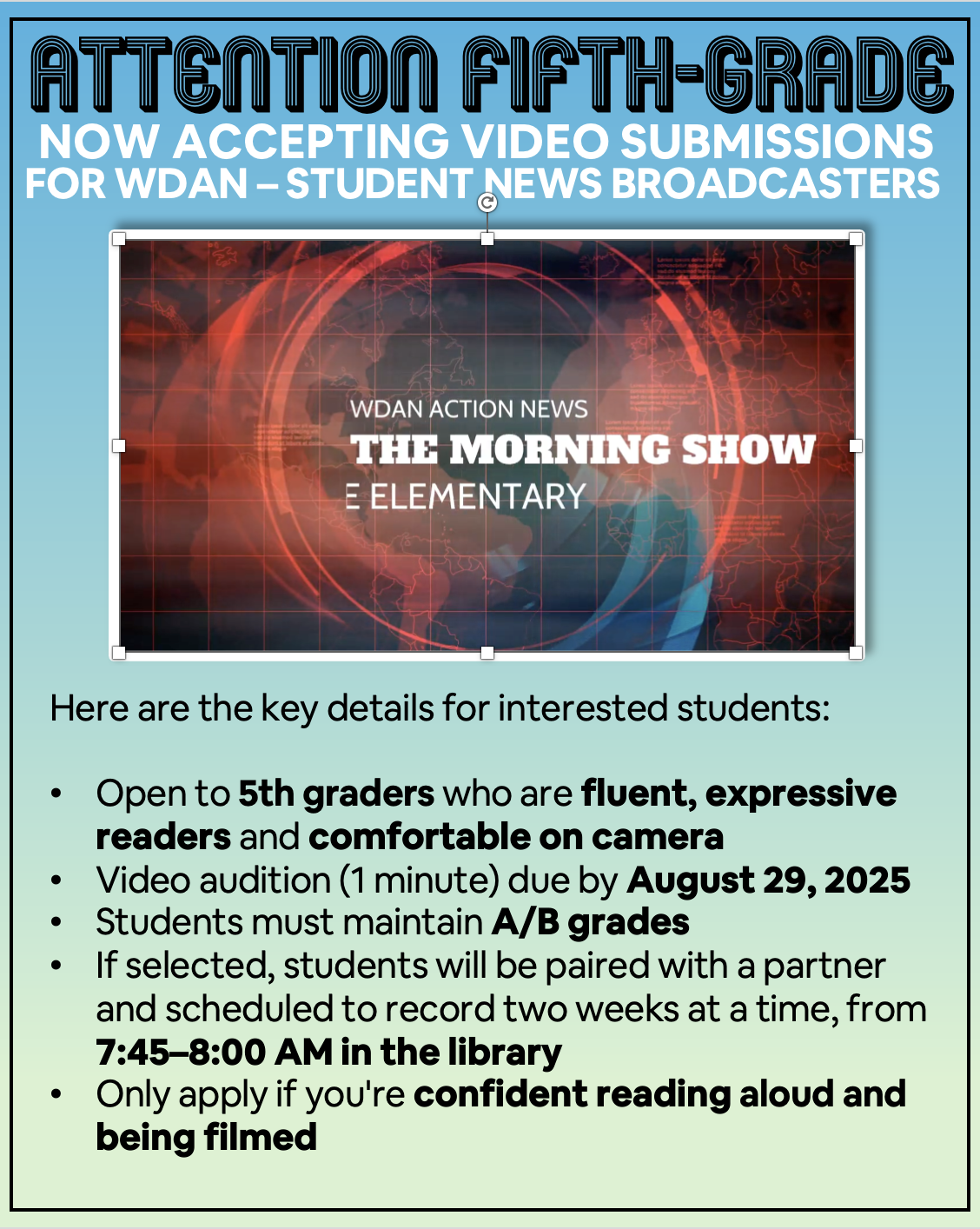 - If selected, students will be paired with a partner and scheduled to record two weeks at a time, from 7:45–8:00 AM in the library