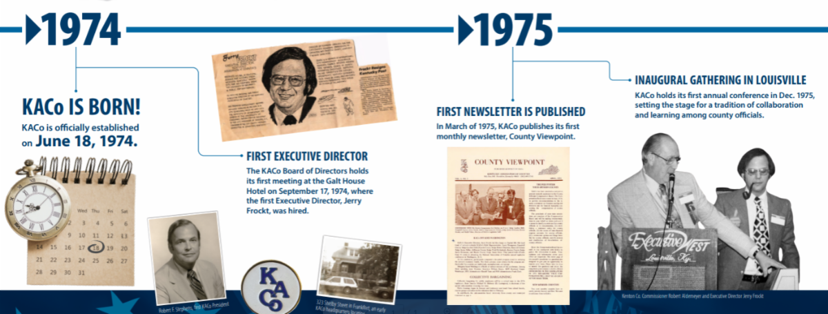 On June 18, 1974, the Kentucky Association of Counties (KACo) was officially formed to provide lobbying services on behalf of county governments. Fayette County Judge Robert F. Stephens was named President.