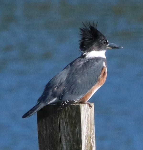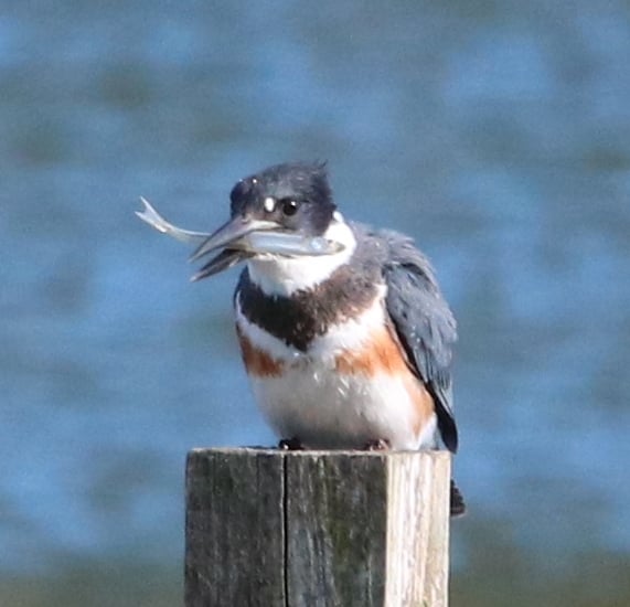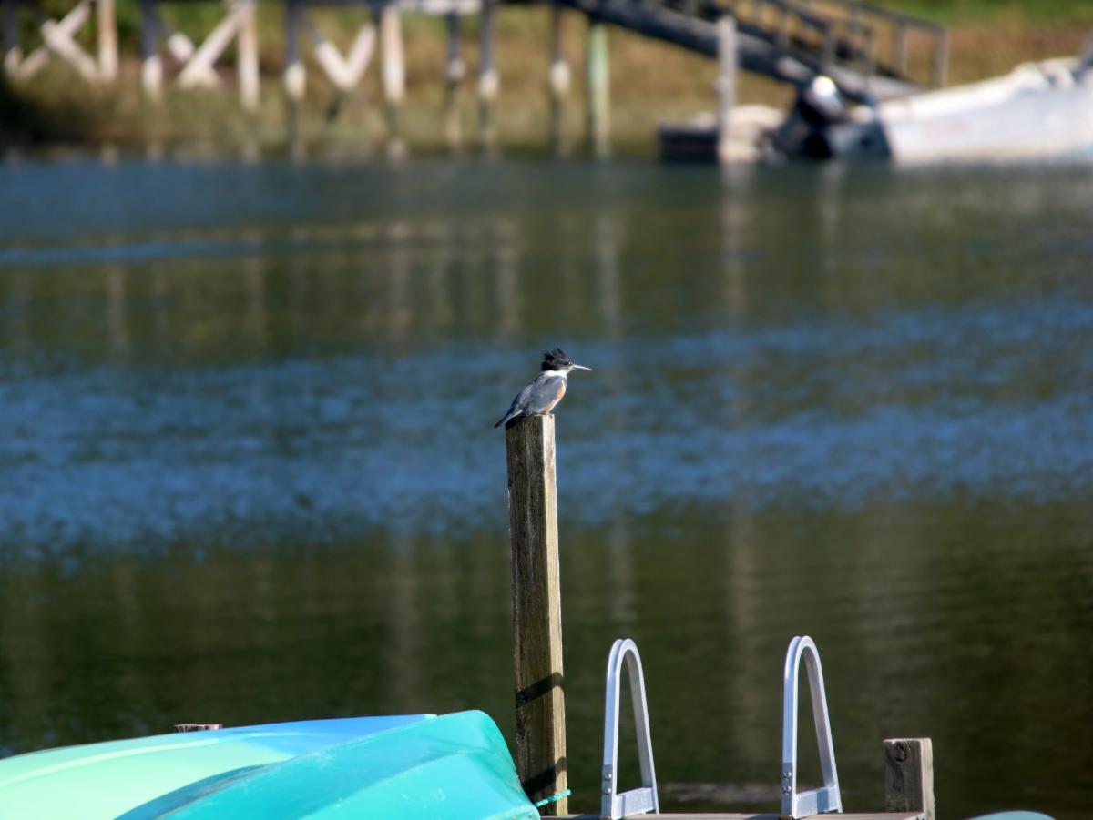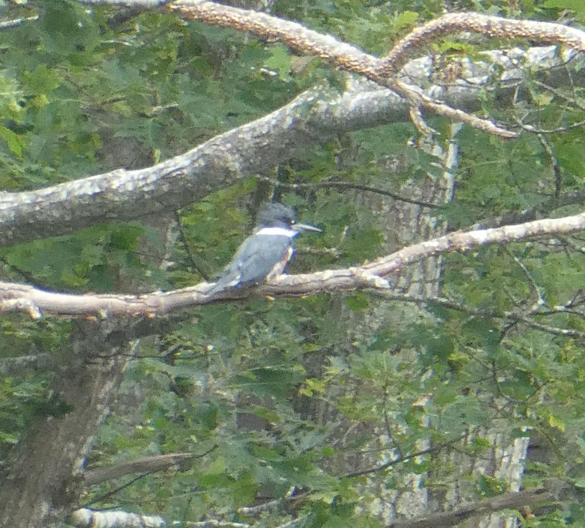 I had not been seeing the kingfishers this summer, but just the last couple of weeks have heard them. Finally saw one landing in a tree along the shore of Orr's Cove and was able to zoom in!