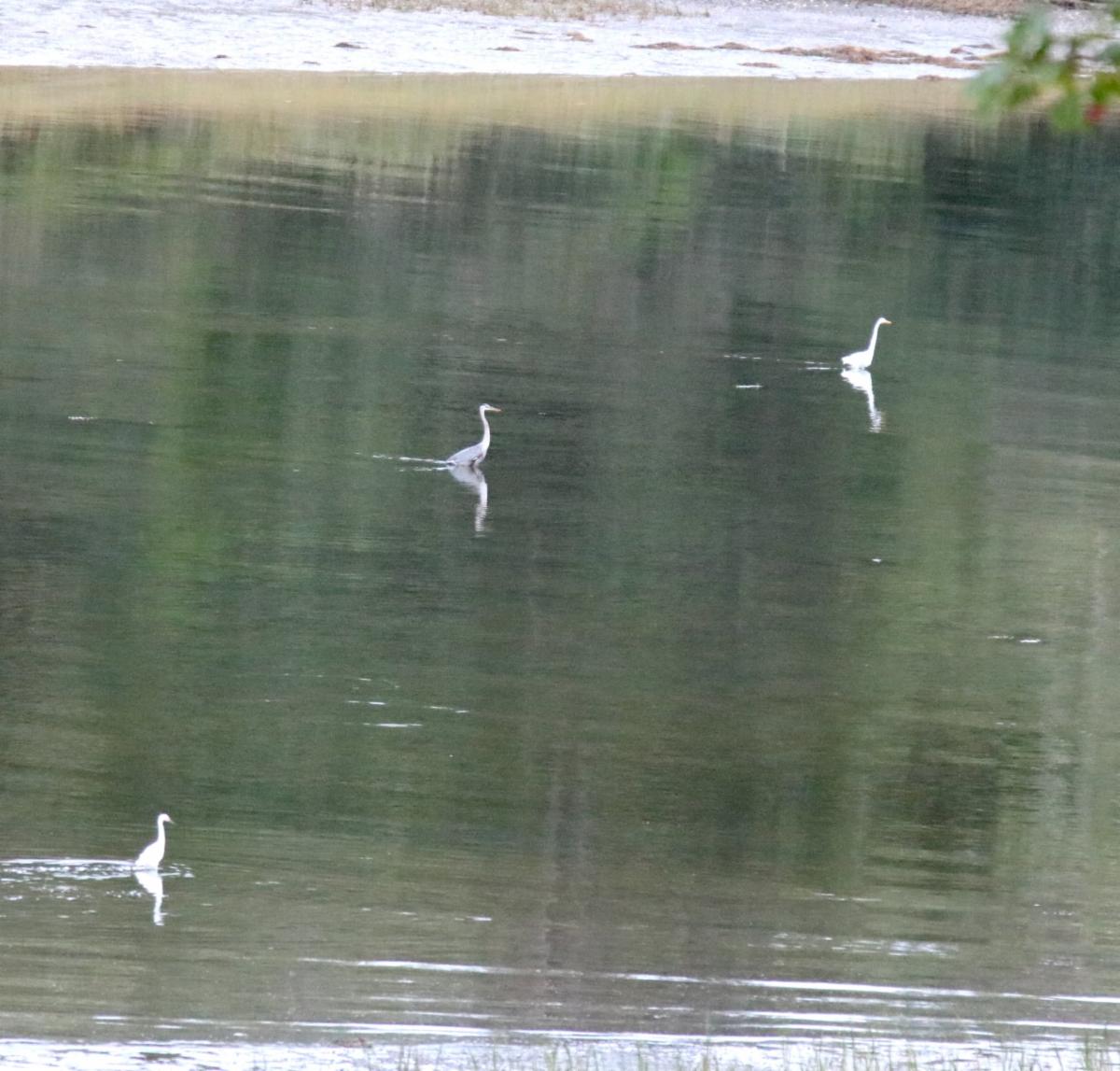 Mid-morning last Sunday we watched a Great Blue Heron and a Great Egret fishing in the cove. The light was excellent and the water was smooth and reflective, and I got these pictures.